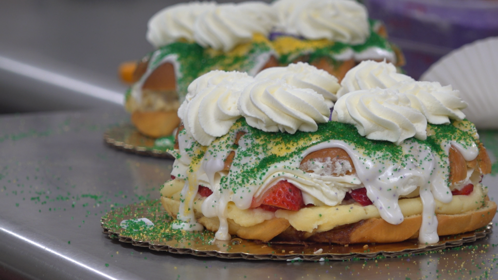 Mùa lễ hội không chỉ nổi bật với những cuộc diễu hành sôi động mà còn với món bánh vua (king cake) trứ danh – một loại bánh ngọt kiểu Pháp phủ lớp đường lấp lánh ba màu xanh, tím và vàng.
