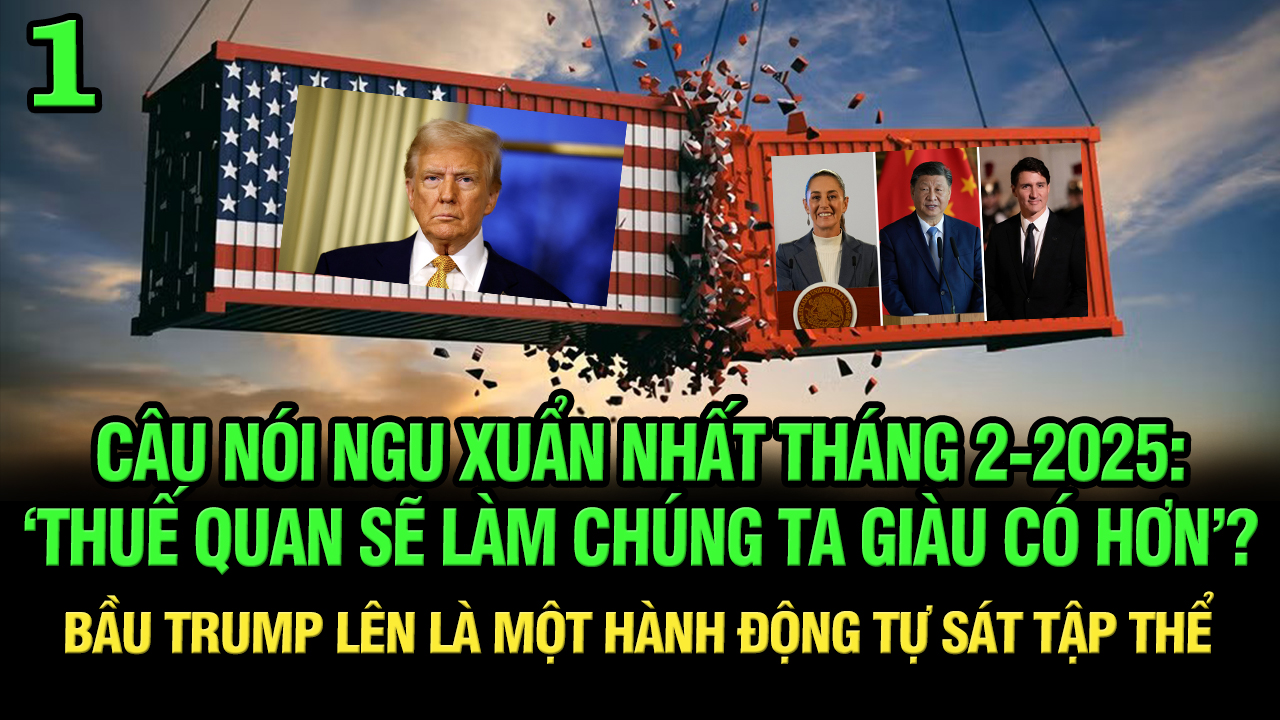 Sign in Welcome! Log into your account your username your password Forgot your password? Get help Password recovery Recover your password your email A password will be e-mailed to you. Câu nói ngu xuẩn nhất tháng 2-2025: “Thuế quan sẽ làm chúng ta giàu có hơn”? February 2, 2025 0 4202 Share FacebookTwitterEmailPrintTelegramViberCopy URL TagsChiến tranh thương mạichủ nghĩa biệt lậpChủ tịch Hạ việnda trắng thượng đẳngDonald Trumpđảng Cộng HòaELON MUSKgiảm thuếMAGA da trắngnền dân trí Mỹngười nhập cưToà án tối caotrục xuấtTrump nhậm chứcTruyền Hình Việt Nam 1việt linh Previous articleTrump chính thức tuyên bố áp thuế lên Canada, Mexico, TQ!Next articleTrump không phải là Vua của nước Mỹ BÀI VIẾT LIÊN QUAN VL2-23.12: MAGA cắn xé nhau tại hội thảo Turning Point USA December 23, 2025 VL1-23.12: Thông báo gây chấn động của Trump: ‘Đi theo hướng hoàn toàn Triều Tiên’ December 23, 2025 Ro Khanna: Ai đã cưỡng hiếp những cô gái vị thành niên này? Tại sao kẻ hiếp lại thoát tội? December 22, 2025 VL2-22.12: Taylor Greene rớt mặt nạ kỳ thị trước khi từ nhiệm? December 22, 2025 VL1-22.12: Todd Blanche là kẻ dối trá, che đậy tội ác và thách thức Quốc hội December 22, 2025 TIỄN BIỆT MỘT NGƯỜI BẠN December 21, 2025 MỚI CẬP NHẬT VL2-23.12: MAGA cắn xé nhau tại hội thảo Turning Point USA December 23, 2025 VL1-23.12: Thông báo gây chấn động của Trump: ‘Đi theo hướng hoàn toàn Triều Tiên’ December 23, 2025 Dân biểu khởi kiện yêu cầu gỡ tên Trump khỏi Trung tâm Kennedy December 22, 2025 Chính quyền Trump yêu cầu gần 30 đại sứ Mỹ rời nhiệm sở December 22, 2025 Quân đội Mỹ tiêu diệt một “khủng bố ma túy” trong đòn tấn công ở phía đông Thái Bình Dương December 22, 2025 Load more