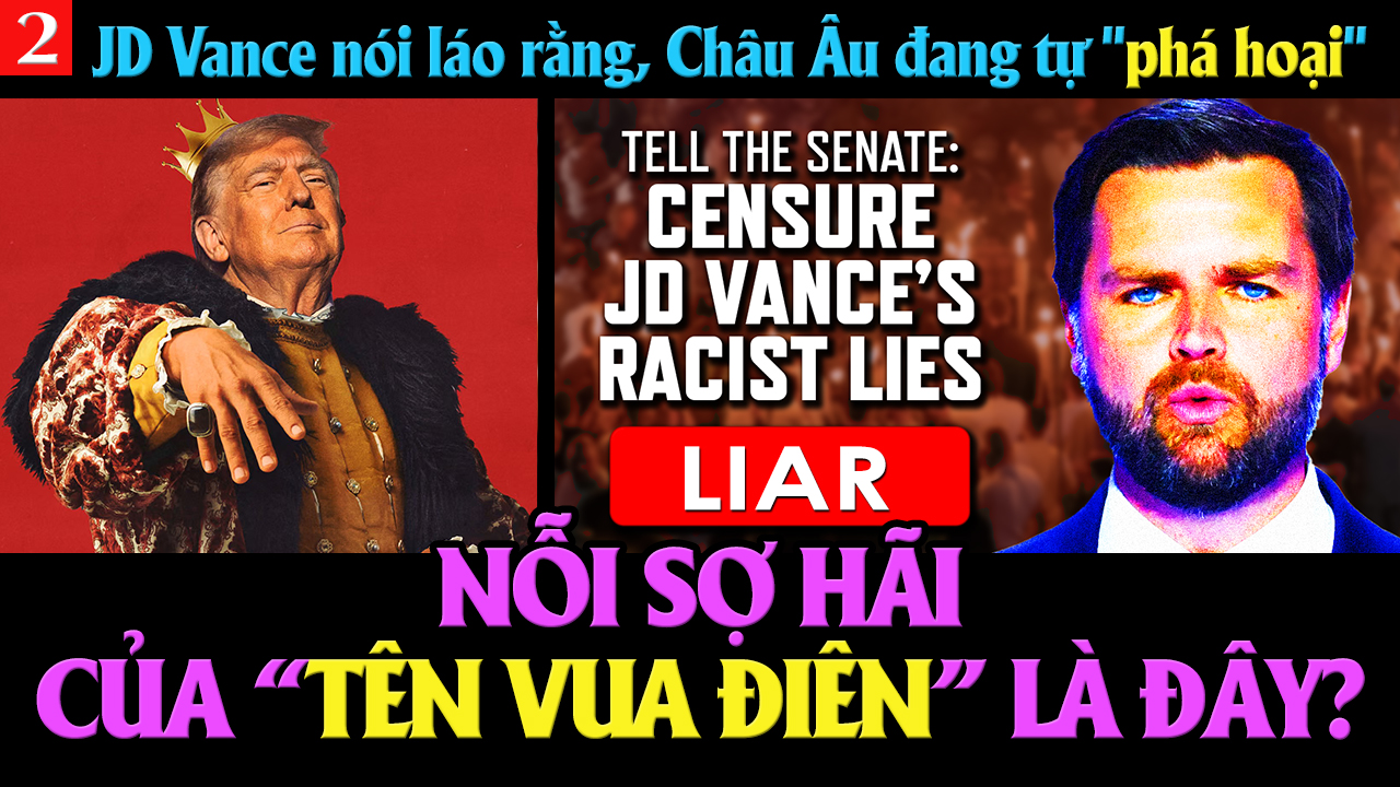Sign in Welcome! Log into your account your username your password Forgot your password? Get help Password recovery Recover your password your email A password will be e-mailed to you. VL2-19.02: JD Vance vu khống Châu Âu đang tự “phá hoại”? February 19, 2026 0 2418 Share FacebookTwitterEmailPrintTelegramViberCopy URL Tagschính quyền Trumpchính sách thuế quanchính trị MỹDonald Trumpđảng Cộng HòaMAGAnền Dân chủ Hoa KỳTruyền Hình Việt Nam 1việt linh Previous articleChăm sóc thai sản sớm — vốn được xem là tốt nhất cho mẹ và bé — đang suy giảm tại MỹNext articleSky River Casino Chào Mừng Tết Nguyên Đán với Màn Biểu Diễn Múa Lân vào Ngày 15 Tháng 02 BÀI VIẾT LIÊN QUAN VL2-20.02: Vụ Andrew bị bắt gây chấn động thế giới có ý nghĩa gì đối với Trump? February 20, 2026 VL1-20.02: Giải mã bài phát biểu của Bush ám chỉ Trump một cách khéo léo February 20, 2026 TRÊN 100.000 NGƯỜI DỰ HỘI CHỢ TẾT BÍNH NGỌ 2026 SAN JOSE BẮC CALIFORNIA February 19, 2026 Dối trá như là “mốt” thời thượng hiện nay ở Mỹ February 19, 2026 Cựu Hoàng tử Andrew bị bắt giữ sau khi các tài liệu về Epstein được công bố February 19, 2026 Tập đoàn Boeing chuyển trụ sở quốc phòng từ Virginia đến St. Louis February 19, 2026 MỚI CẬP NHẬT VL2-20.02: Vụ Andrew bị bắt gây chấn động thế giới có ý nghĩa gì đối với Trump? February 20, 2026 VL1-20.02: Giải mã bài phát biểu của Bush ám chỉ Trump một cách khéo léo February 20, 2026 Ứng viên Thượng viện bang Illinois tung quảng cáo tranh cử với thông điệp “F— Trump” February 19, 2026 HOÀNG TỬ ANDREW ĐÃ BỊ CẢNH SÁT ANH BẮT GIỮ VÌ LIÊN QUAN ĐẾN HỒ SƠ ẤU DÂM EPSTEIN February 19, 2026 TRÊN 100.000 NGƯỜI DỰ HỘI CHỢ TẾT BÍNH NGỌ 2026 SAN JOSE BẮC CALIFORNIA February 19, 2026 Load more