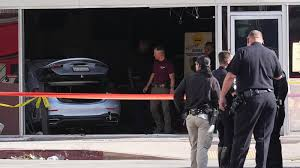 Hình ảnh từ truyền hình cho thấy một chiếc sedan màu bạc, cốp sau mở toang, nằm hẳn bên trong cửa hàng trên đại lộ Westwood.