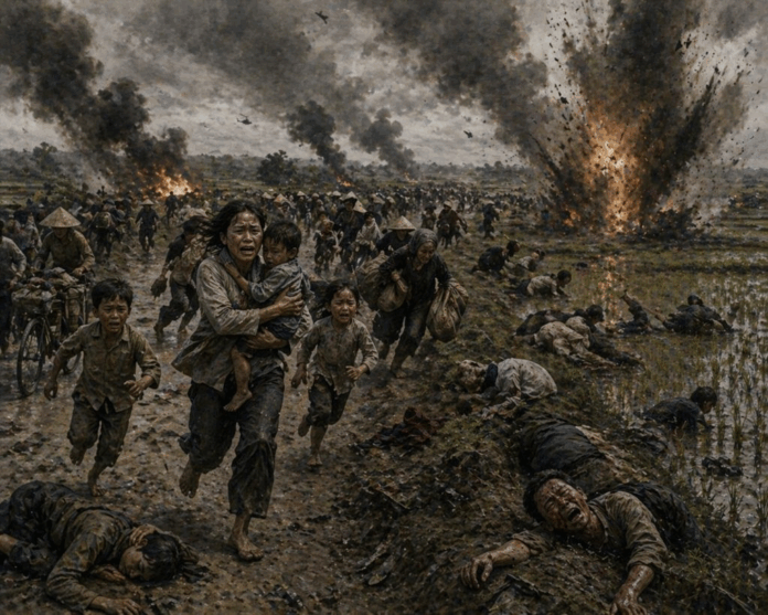 Tiếng pháo kích bất ngờ dội xuống. Những tiếng nổ chát chúa xé toạc không gian, đất đá tung lên mù mịt. Người ngã xuống từng loạt. Có người trúng đạn, có người bị mảnh pháo xé thân, có người chỉ vì quá hoảng loạn mà bị dẫm đạp trong dòng người tháo chạy. Tiếng khóc, tiếng la hét, tiếng gọi nhau trong tuyệt vọng hòa lẫn vào nhau, tạo thành một âm thanh kinh hoàng mà đến nay tôi vẫn còn nghe vang vọng trong tâm trí.