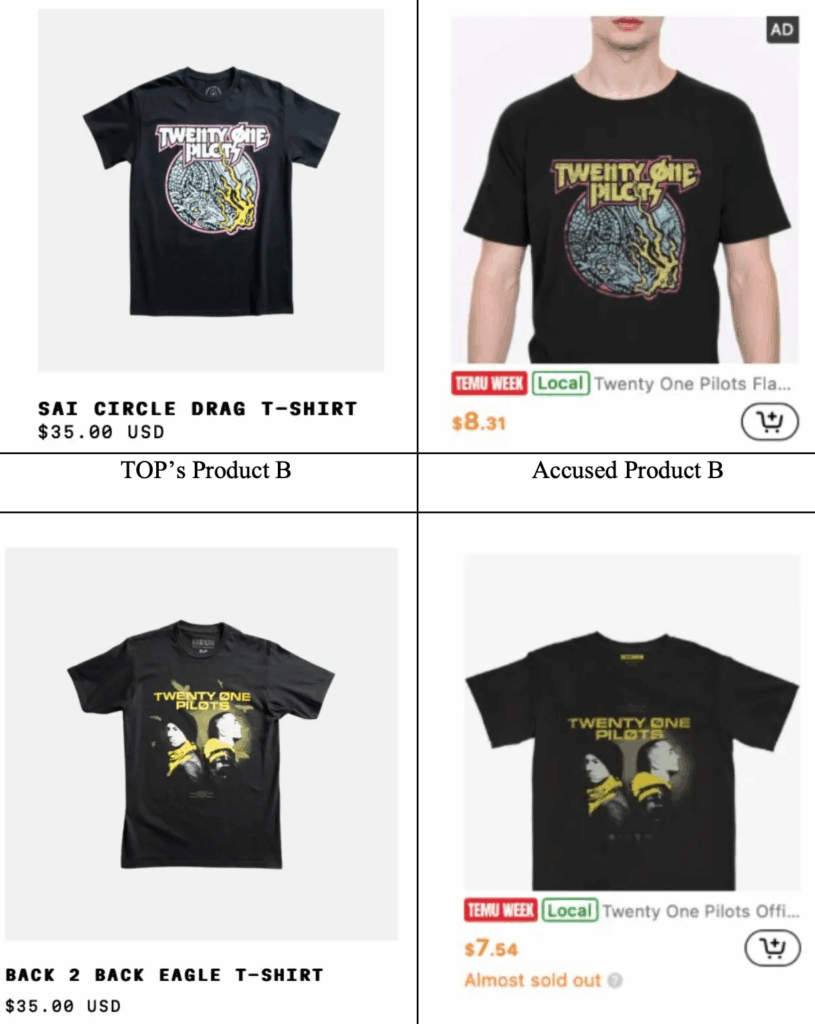 Trong hồ sơ, Twenty One Pilots, gồm Tyler Joseph và Josh Dun, đã đưa ra các ví dụ về hàng hóa bị cáo buộc là giả, bao gồm một chiếc áo giá 35 đô la được bán trên trang web của ban nhạc có in logo của họ và một con rồng, và phiên bản giá 8,51 đô la của Temu.