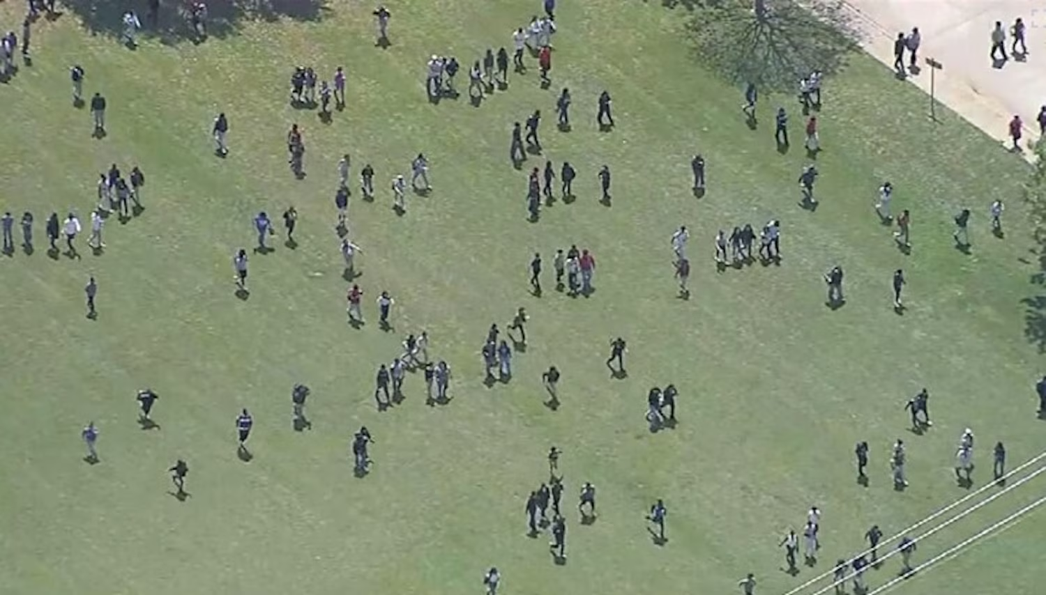 Video tại hiện trường cho thấy học sinh sơ tán khỏi trường khi xe cảnh sát và cứu hỏa kéo đến.