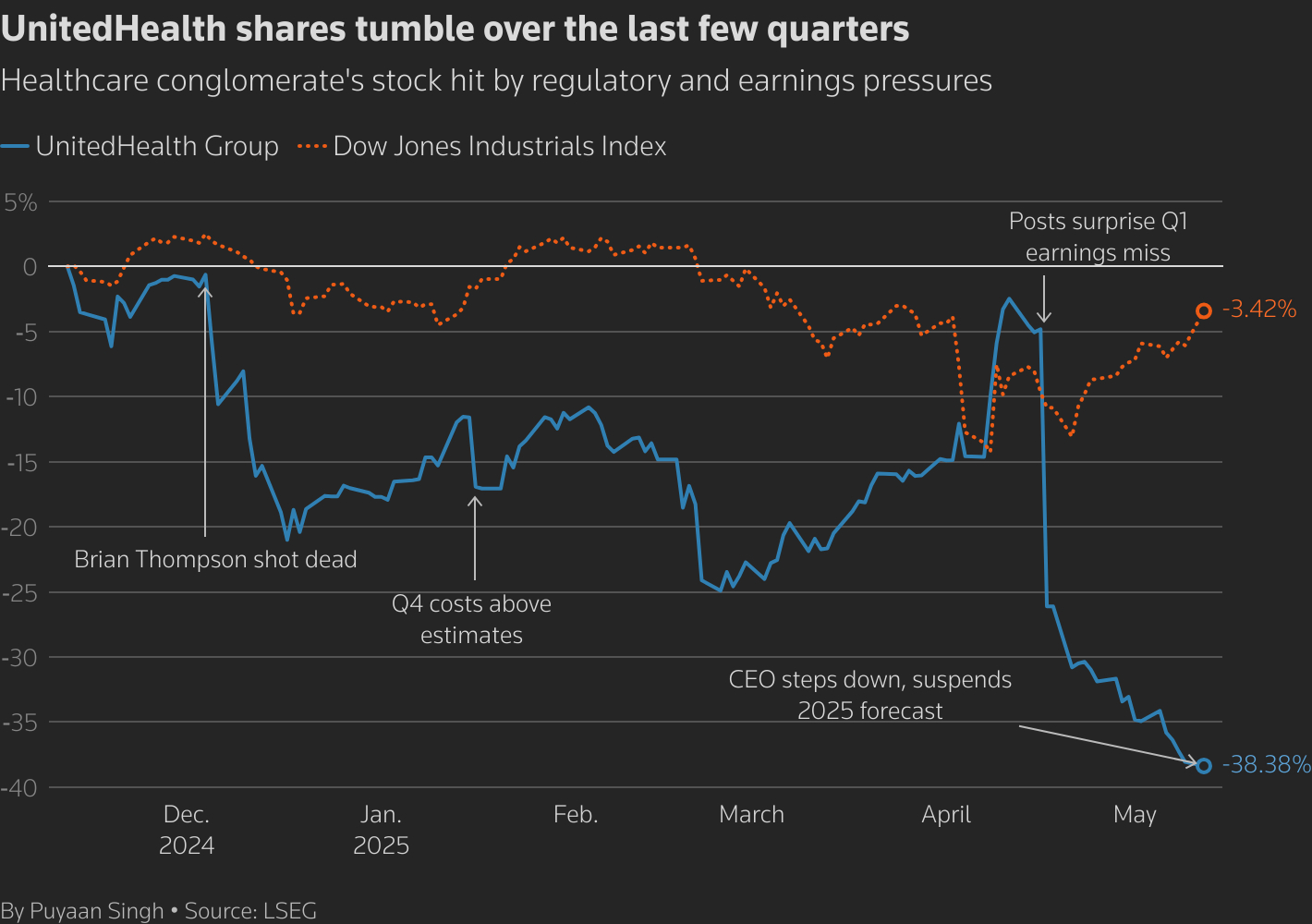 Trong vòng một năm qua, UnitedHealth gặp nhiều vấn đề như tấn công mạng ảnh hưởng đến 190 triệu người, điều tra liên quan đến thanh toán Medicare, và chi phí y tế gia tăng đột ngột. Vụ CEO bộ phận bảo hiểm bị sát hại cuối năm ngoái cũng khiến tình hình trở nên căng thẳng hơn.