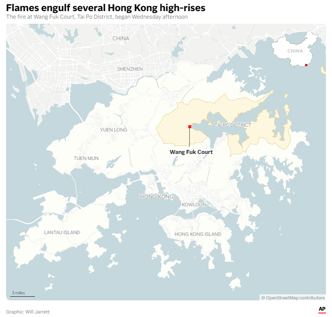 Một số cơ quan truyền thông địa phương đưa tin cảnh sát đã bắt giữ ba người đàn ông bị tình nghi ngộ sát liên quan đến vụ hỏa hoạn bùng phát vào chiều thứ Tư tại một khu nhà ở thuộc quận Tai Po, một vùng ngoại ô thuộc khu Tân Giới. Đến sáng thứ Năm giờ địa phương, đám cháy vẫn chưa được dập tắt và công tác cứu hộ vẫn tiếp tục, với số người chết đã lên tới 44.