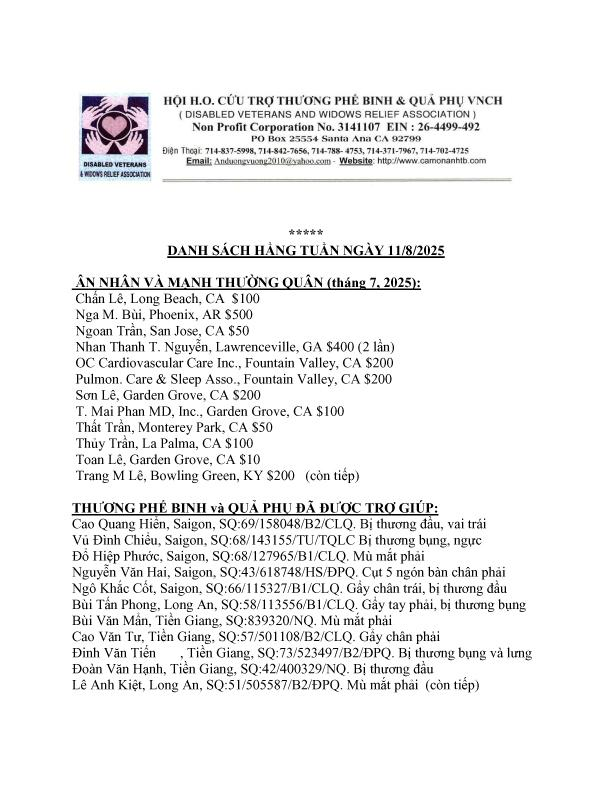 Sign in Welcome! Log into your account your username your password Forgot your password? Get help Password recovery Recover your password your email A password will be e-mailed to you. Danh sách ân nhân gởi tiền cho Hội HO cứu trợ Thương Phế Binh hằng tuần – 11/8/2025 August 12, 2025 0 947 Share FacebookTwitterEmailPrintTelegramViberCopy URL Previous article“Nếu TQ thành cường quốc số 1, thì không phải do họ giành được, mà do Mỹ tự vứt bỏ.”Next articleWalmart sẽ trả 5,6 triệu đô la để giải quyết vụ kiện Bảo vệ người tiêu dùng California BÀI VIẾT LIÊN QUAN Tối cao Pháp viện sẽ quyết định liệu sắc lệnh của Trump về quyền công dân theo nơi sinh có vi hiến hay không December 5, 2025 Cựu quan chức cấp cao của DEA bị cáo buộc âm mưu buôn ma túy và rửa hàng triệu đô la cho cartel Mexico December 5, 2025 Nữ dân biểu Dân chủ cho biết bà bị xịt hơi cay trong một cuộc bố ráp của ICE tại Arizona December 5, 2025 Chính quyền Trump sẽ mở rộng lệnh cấm đi lại lên hơn 30 quốc gia, bà Noem cho biết December 5, 2025 Thẩm phán liên bang Mỹ cho phép Bộ Tư pháp công bố biên bản đại bồi thẩm trong hồ sơ Epstein December 5, 2025 LIÊN MINH TÂN DÂN CHỦ KÊU GỌI HEGSETH TỪ CHỨC BỘ QUỐC PHÒNG. December 5, 2025 MỚI CẬP NHẬT Tối cao Pháp viện sẽ quyết định liệu sắc lệnh của Trump về quyền công dân theo nơi sinh có vi hiến hay không December 5, 2025 Cựu quan chức cấp cao của DEA bị cáo buộc âm mưu buôn ma túy và rửa hàng triệu đô la cho cartel Mexico December 5, 2025 Nữ dân biểu Dân chủ cho biết bà bị xịt hơi cay trong một cuộc bố ráp của ICE tại Arizona December 5, 2025 Chính quyền Trump sẽ mở rộng lệnh cấm đi lại lên hơn 30 quốc gia, bà Noem cho biết December 5, 2025 Thẩm phán liên bang Mỹ cho phép Bộ Tư pháp công bố biên bản đại bồi thẩm trong hồ sơ Epstein December 5, 2025 Load more