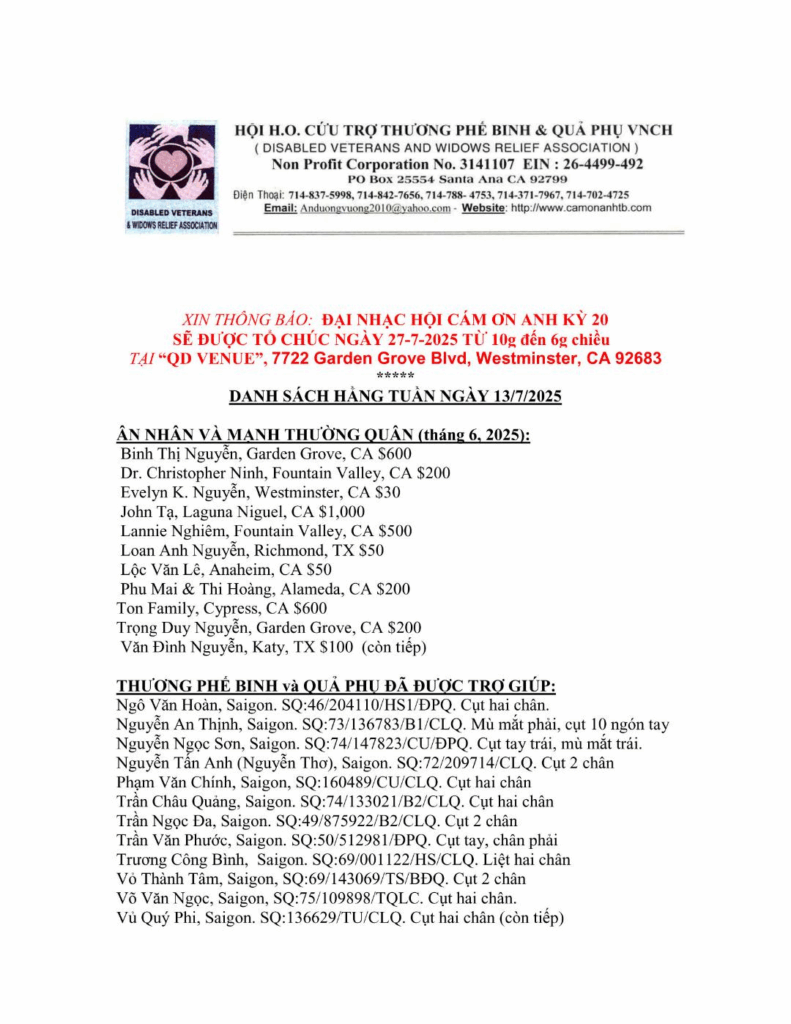 Sign in Welcome! Log into your account your username your password Forgot your password? Get help Password recovery Recover your password your email A password will be e-mailed to you. danh sách ân nhân gởi tiền cho Hội HO cứu trợ Thương Phế Binh hằng tuần – 13/7/2025 July 15, 2025 0 769 Share FacebookTwitterEmailPrintTelegramViberCopy URL Previous articleThư Ủng Hộ Nghị quyết Liên Viện ACR 71 (Kalra), Đặt tên một đoạn của Xa lộ Tiểu bang 101 là “Xa lộ Sài Gòn Nhỏ”Next articleCha đâm chết con trai tại công viên San Jose trước khi cảnh sát nổ súng BÀI VIẾT LIÊN QUAN Sức mạnh cộng đồng đa chủng San Jose December 13, 2025 Mỹ thu giữ tàu chở dầu gần Venezuela đúng lúc lệnh tòa sắp hết hạn, tài liệu tòa án cho thấy December 12, 2025 Hạ viện Cộng hòa công bố dự luật y tế không gia hạn trợ cấp ObamaCare December 12, 2025 Hạ viện Cộng hòa dọa khởi động thủ tục khinh thường Quốc hội với vợ chồng Clinton December 12, 2025 37 nhà tài trợ đứng sau khoản chi 300 triệu USD cho phòng khiêu vũ tại Tòa Bạch Ốc của ông Trump December 12, 2025 Ông Trump: Thái Lan – Campuchia đồng ý tái lập ngừng bắn December 12, 2025 MỚI CẬP NHẬT Sức mạnh cộng đồng đa chủng San Jose December 13, 2025 Mỹ thu giữ tàu chở dầu gần Venezuela đúng lúc lệnh tòa sắp hết hạn, tài liệu tòa án cho thấy December 12, 2025 Hạ viện Cộng hòa công bố dự luật y tế không gia hạn trợ cấp ObamaCare December 12, 2025 Hạ viện Cộng hòa dọa khởi động thủ tục khinh thường Quốc hội với vợ chồng Clinton December 12, 2025 37 nhà tài trợ đứng sau khoản chi 300 triệu USD cho phòng khiêu vũ tại Tòa Bạch Ốc của ông Trump December 12, 2025 Load more