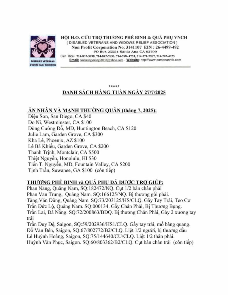 Sign in Welcome! Log into your account your username your password Forgot your password? Get help Password recovery Recover your password your email A password will be e-mailed to you. Danh sách ân nhân gởi tiền cho Hội HO cứu trợ Thương Phế Binh hằng tuần – 27/7/2025 July 31, 2025 0 913 Share FacebookTwitterEmailPrintTelegramViberCopy URL Previous articleTrump tuyên bố đạt thỏa thuận thuế quan 15% với Hàn Quốc Next articleDẸP TRUYỀN THÔNG CÔNG CỘNG, TRUMP XÂY PHÒNG NHẢY ĐẦM BẠCH ỐC 200 TRIỆU ĐÔLA BÀI VIẾT LIÊN QUAN Sức mạnh cộng đồng đa chủng San Jose December 13, 2025 Mỹ thu giữ tàu chở dầu gần Venezuela đúng lúc lệnh tòa sắp hết hạn, tài liệu tòa án cho thấy December 12, 2025 Hạ viện Cộng hòa công bố dự luật y tế không gia hạn trợ cấp ObamaCare December 12, 2025 Hạ viện Cộng hòa dọa khởi động thủ tục khinh thường Quốc hội với vợ chồng Clinton December 12, 2025 37 nhà tài trợ đứng sau khoản chi 300 triệu USD cho phòng khiêu vũ tại Tòa Bạch Ốc của ông Trump December 12, 2025 Ông Trump: Thái Lan – Campuchia đồng ý tái lập ngừng bắn December 12, 2025 MỚI CẬP NHẬT Sức mạnh cộng đồng đa chủng San Jose December 13, 2025 Mỹ thu giữ tàu chở dầu gần Venezuela đúng lúc lệnh tòa sắp hết hạn, tài liệu tòa án cho thấy December 12, 2025 Hạ viện Cộng hòa công bố dự luật y tế không gia hạn trợ cấp ObamaCare December 12, 2025 Hạ viện Cộng hòa dọa khởi động thủ tục khinh thường Quốc hội với vợ chồng Clinton December 12, 2025 37 nhà tài trợ đứng sau khoản chi 300 triệu USD cho phòng khiêu vũ tại Tòa Bạch Ốc của ông Trump December 12, 2025 Load more