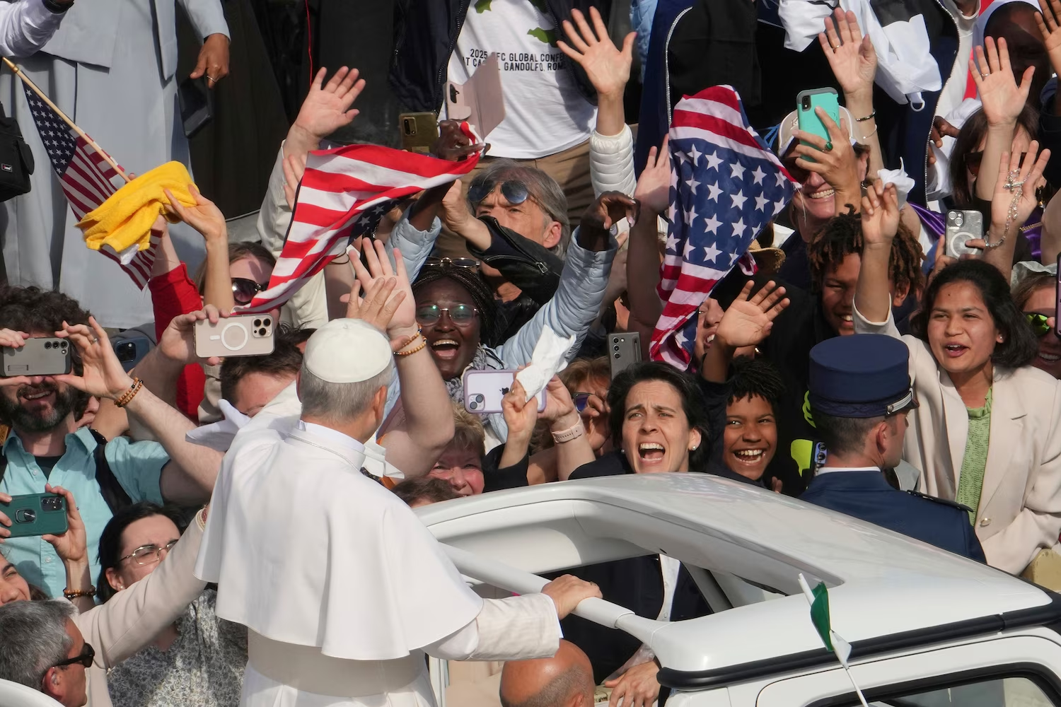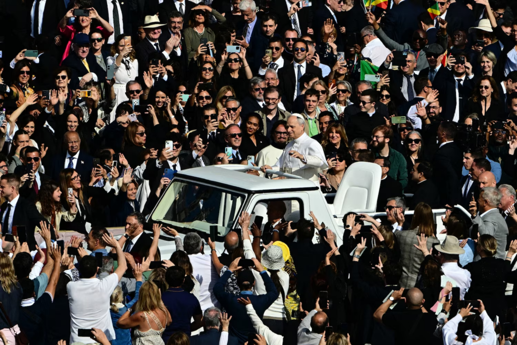 Trước đó, vào buổi sáng, Giáo hoàng Leo đã di chuyển qua Quảng trường Thánh Phêrô trên chiếc xe giáo hoàng mui trần, vẫy tay chào hàng chục nghìn người tập trung tại đây. Theo Văn phòng Báo chí Vatican, khoảng 100.000 người đã có mặt để tận mắt nhìn thấy tân Giáo hoàng.