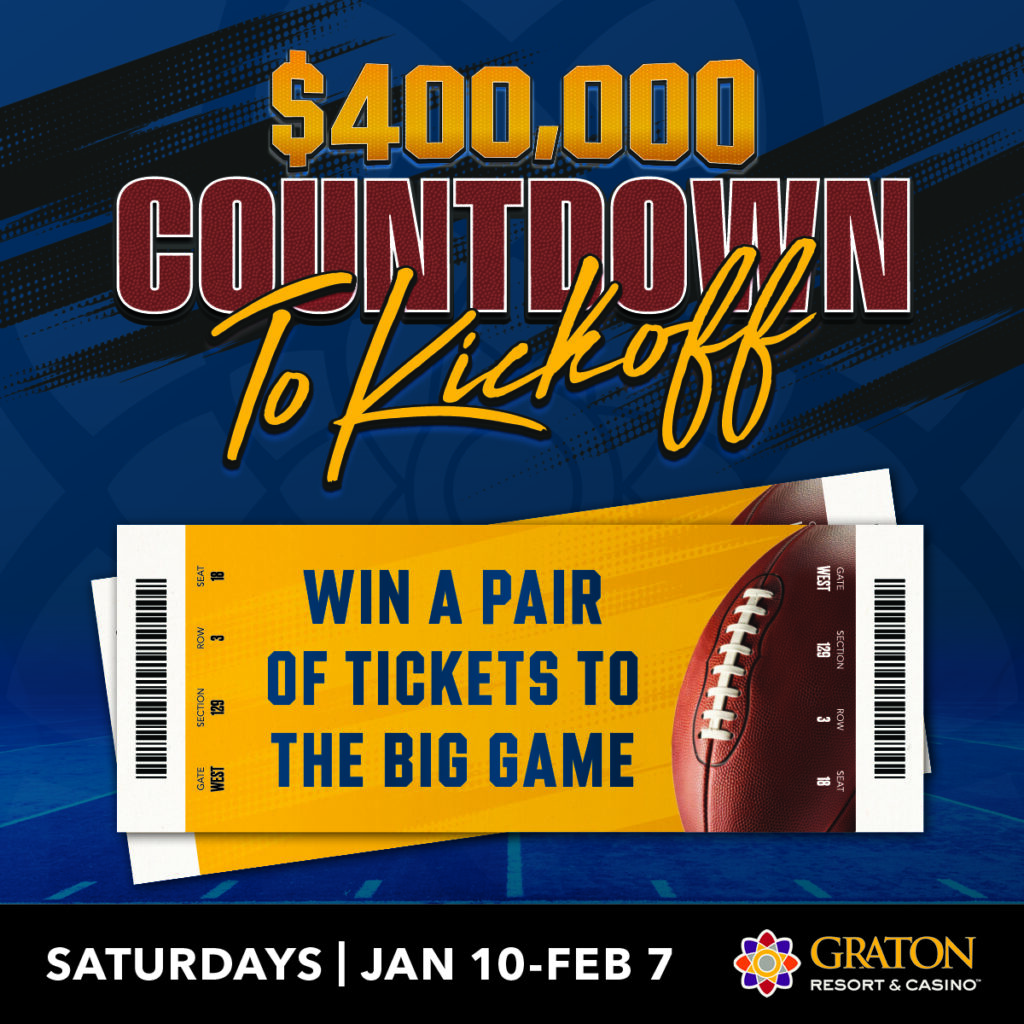 Hãy chuẩn bị cho mùa Football đầy hứng thú nhất! Graton Resort & Casino sẽ tổ chức chương trình Tặng Thưởng Đếm Ngược Để Khởi Động vào mỗi Thứ Bảy, từ 10 tháng Giêng đến 7 tháng Hai. Hãy tham dự vào chương trình xổ số được tổ chức vào mỗi giờ, từ 7PM đến 11PM. Vào mỗi Thứ Bảy, có 60 người trúng may mắn sẽ có được $500 đô la Chơi Máy Kéo Miễn Phí, và 20 người sẽ mang về nhà một TV Samsung 85” tuyệt vời. Mức giải cao nhất là xổ số lúc 11PM, một người trúng giải lớn sẽ nhận được một cặp vé cho Trận Đấu Lớn!