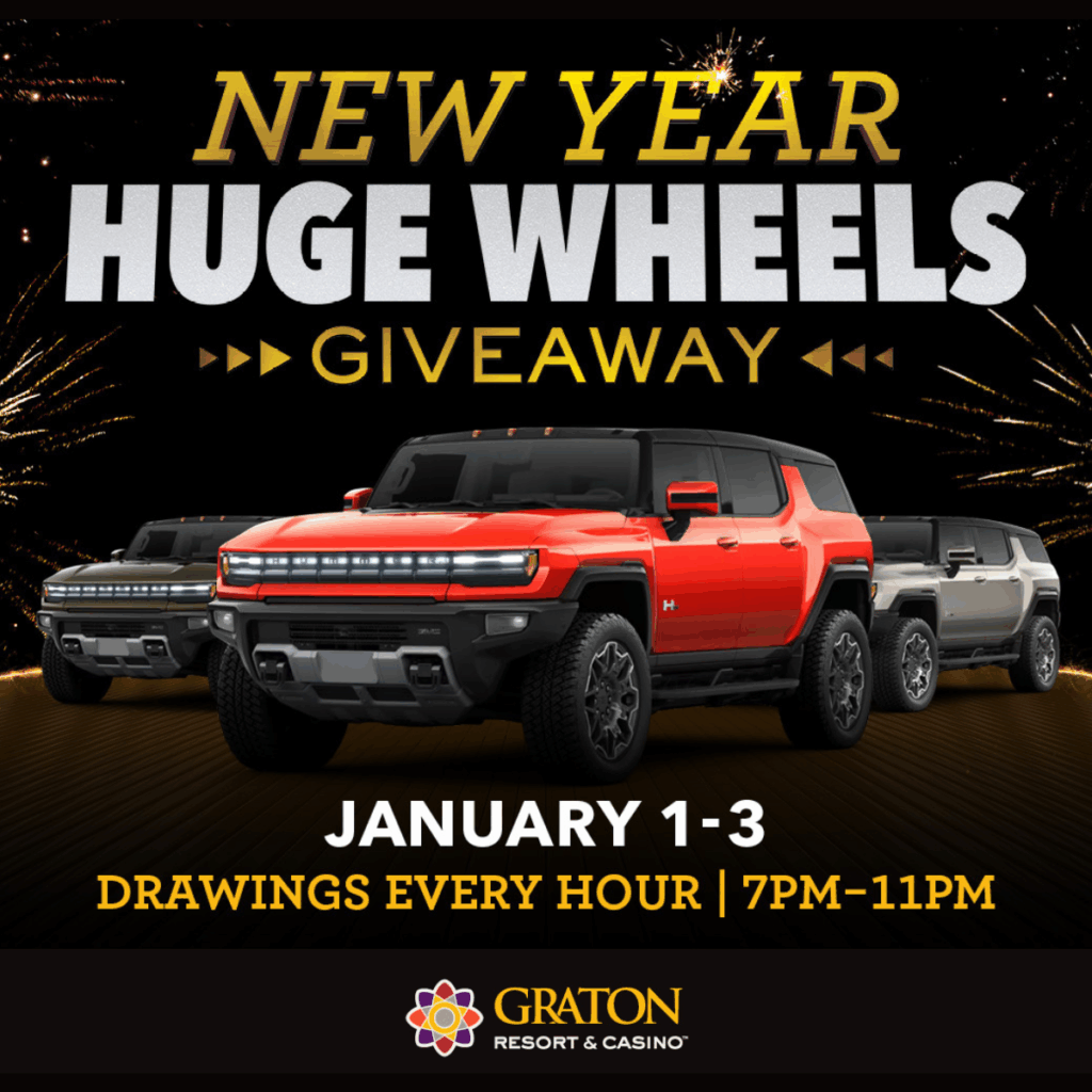 Chào đón Năm Mới với cơ hội lái xe về trong xe điện sang trọng! Graton Resort & Casino giới thiệu chương trình tặng thưởng Năm Mới, Bánh Xe Khổng Lồ, từ Thứ Năm, 1 tháng Giêng đến Thứ Bảy 3 tháng Giêng. Xổ số sẽ diễn ra vào mỗi giờ, từ 7PM đến 11PM, tại đây có 80 người trúng mỗi ngày sẽ chia cho $500 đô la Chơi Máy Kéo Miễn Phí! Đừng bỏ lỡ đêm chung kết mỗi đêm lúc 11PM để có cơ hội trúng một xe GMC Hummer EV SUV 2026!