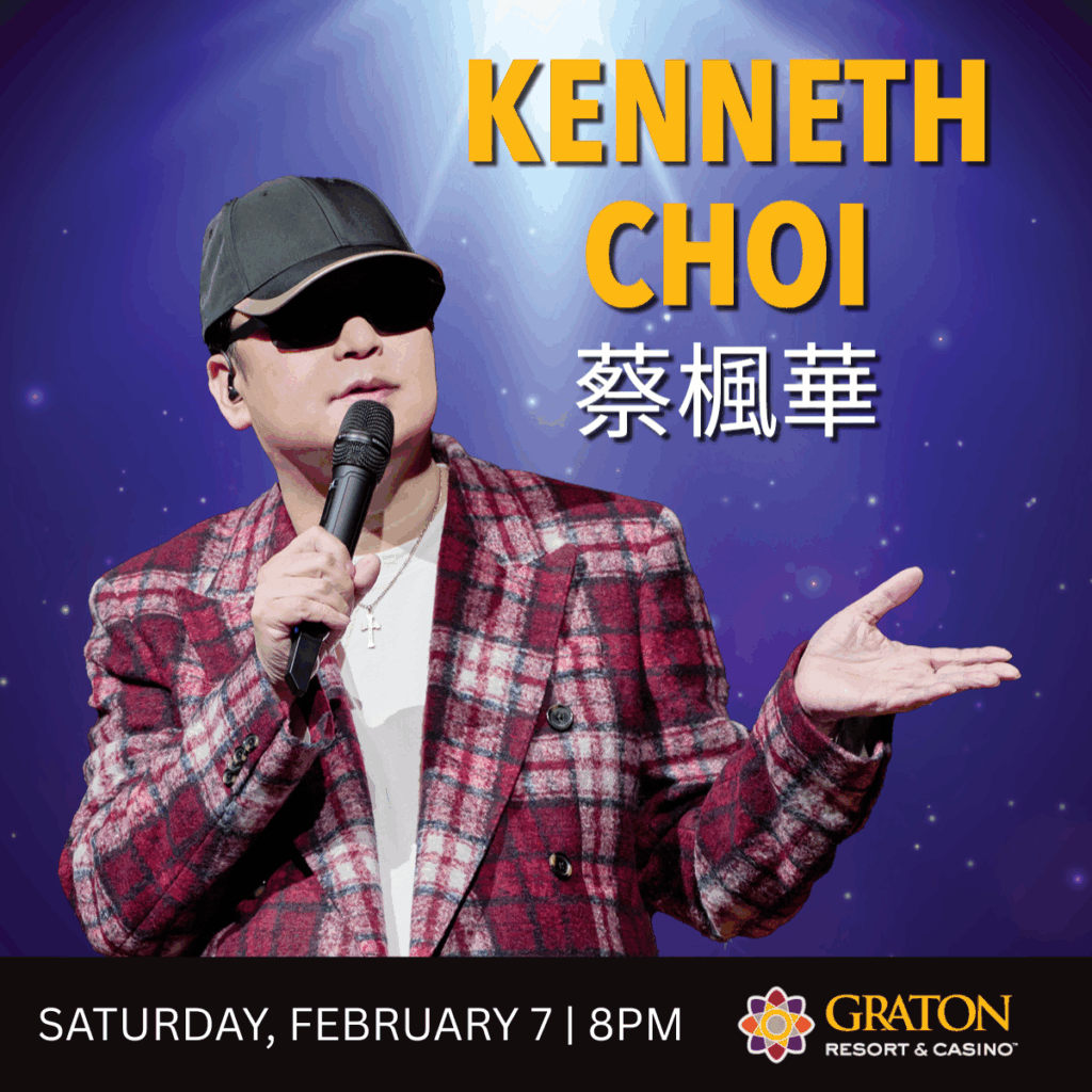 Kenneth Choi sẽ biểu diễn tại Graton Resort & Casino vào Thứ Bảy, 7 tháng 2 lúc 8PM. Sau khi nổi tiếng vào đầu những năm 1980, Choi trở thành một trong những giọng ca đặc trưng của thời kỳ Cantopop. Nổi tiếng với giọng hát mượt mà và những bản ballad lãng mạn, ca khúc nổi tiếng của anh “Beautiful Silhouette” đã mang về cho anh giải RTHK Top 10 Gold Songs.