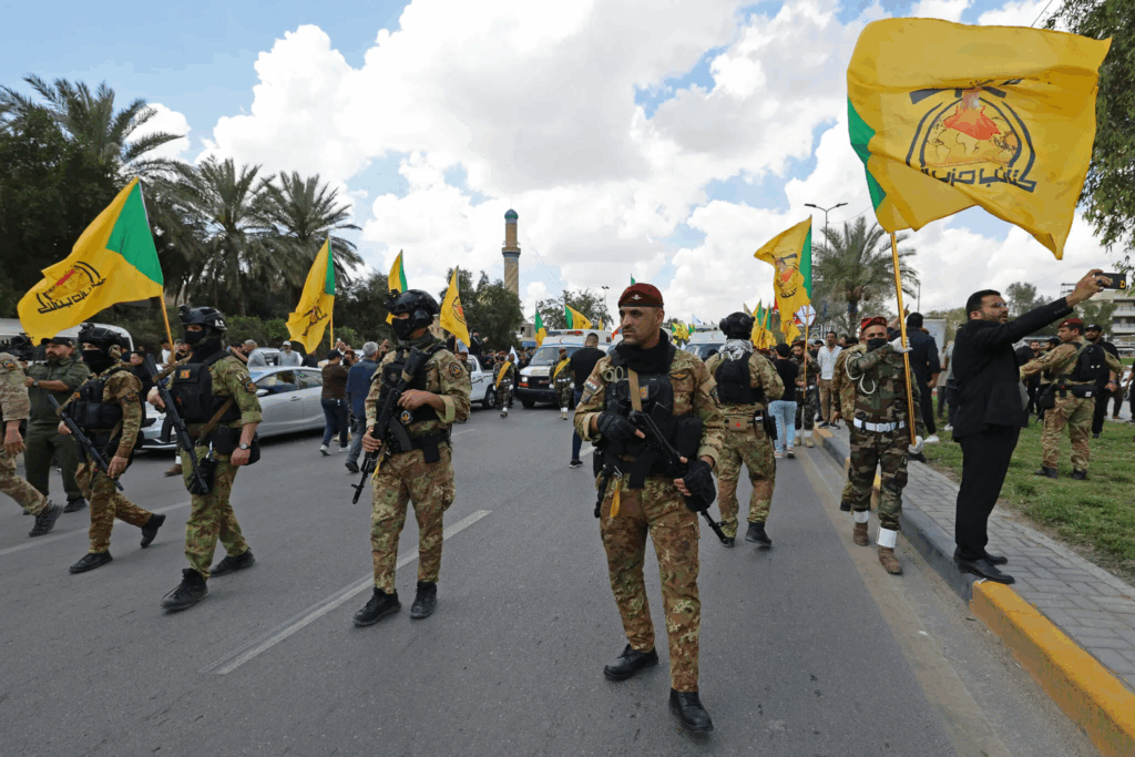 Các thành viên của Kataib Hezbollah, một lực lượng dân quân Iraq được Iran hậu thuẫn, tham gia một cuộc tuần hành tưởng niệm ở Baghdad hồi đầu tháng này để tưởng nhớ một đồng đội đã thiệt mạng.Tín dụng…Ahmad Al-Rubaye/Agence France-Presse — Hình ảnh Getty