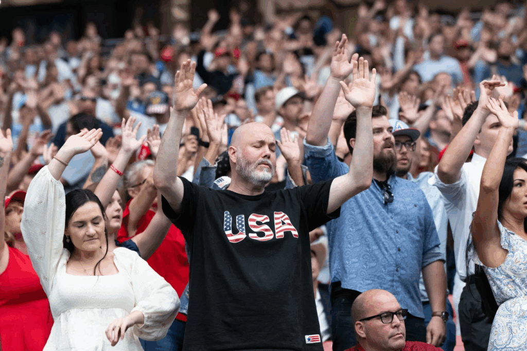 Những người ủng hộ Charlie Kirk giơ tay trong khi một ca sĩ Cơ đốc giáo dẫn đầu đám đông trong buổi lễ tưởng niệm Charlie Kirk tại Sân vận động State Farm ở Glendale, Arizona, vào Chủ Nhật.