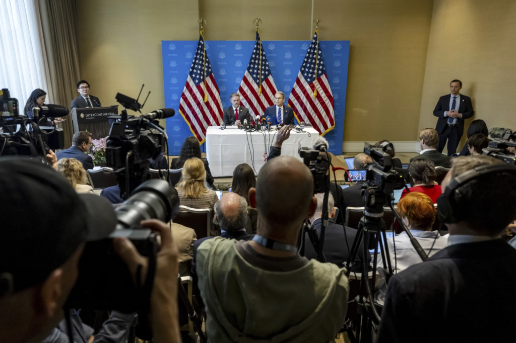 Greer và Bộ trưởng Tài chính Scott Bessent đã công bố việc giảm thuế quan tại một cuộc họp báo ở Geneva.