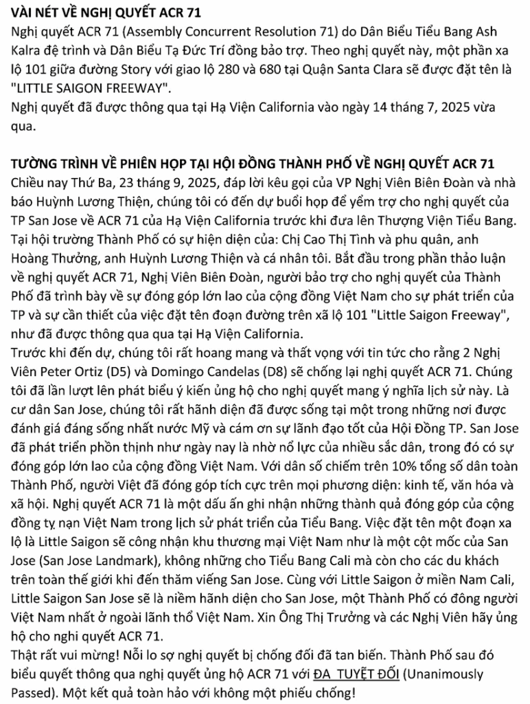 Sign in Welcome! Log into your account your username your password Forgot your password? Get help Password recovery Recover your password your email A password will be e-mailed to you. Họp Hội Đồng TP Về Nghị Quyết ACR 71 September 24, 2025 0 659 Share FacebookTwitterEmailPrintTelegramViberCopy URL TagsLittle Saigon FreewayNghị Quyết ACR 71 Previous articleCalifornia đưa ra mức phạt lịch sử vì luật sư bịa đặt ChatGPTNext articleAmazon thu hồi 500.000 sản phẩm vì lý do an toàn BÀI VIẾT LIÊN QUAN VL1-05.12: Ai nói mặc ai, tớ già rồi, mệt thì ngủ một chút mà? December 5, 2025 Putin nói có những điểm ông không thể chấp nhận trong đề xuất của Mỹ nhằm chấm dứt chiến tranh Nga – Ukraine December 4, 2025 Chủ tịch Hạ viện Johnson kêu gọi đảng Cộng hòa giữ kín bất đồng sau một tuần đầy sóng gió December 4, 2025 Du tăng Thích Minh Tánh: 41 năm xa quê hương Việt Nam! December 4, 2025 Truyền thông Mỹ: Trump “quyền lợi” là xong. Nhiệm kỳ Trump dường như đã kết thúc December 4, 2025 Bộ Tư pháp không thể đảm bảo bản cáo trạng mới của James từ bồi thẩm đoàn December 4, 2025 MỚI CẬP NHẬT VL1-05.12: Ai nói mặc ai, tớ già rồi, mệt thì ngủ một chút mà? December 5, 2025 Putin nói có những điểm ông không thể chấp nhận trong đề xuất của Mỹ nhằm chấm dứt chiến tranh Nga – Ukraine December 4, 2025 Chủ tịch Hạ viện Johnson kêu gọi đảng Cộng hòa giữ kín bất đồng sau một tuần đầy sóng gió December 4, 2025 Du tăng Thích Minh Tánh: 41 năm xa quê hương Việt Nam! December 4, 2025 Truyền thông Mỹ: Trump “quyền lợi” là xong. Nhiệm kỳ Trump dường như đã kết thúc December 4, 2025 Load more