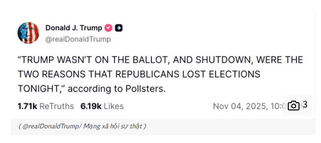 “’TRUMP KHÔNG CÓ TÊN TRONG PHIẾU BẦU CỬ và VIỆC TẮT CỬA CHÍNH LÀ HAI LÝ DO KHIẾN ĐẢNG CỘNG HÒA THUA CUỘC BẦU CỬ TỐI NAY,’ theo các nhà thăm dò ý kiến”, tổng thống viết trên Truth Social.Bài đăng của Trump xuất hiện vài phút sau khi có thông báo rằng