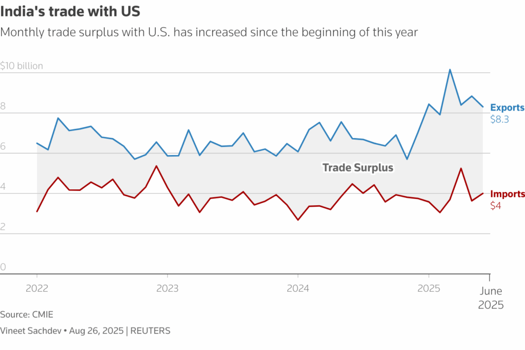 Một mức thuế trừng phạt 25% được áp đặt do Ấn Độ mua dầu từ Nga nay được cộng thêm với thuế 25% trước đó đối với nhiều mặt hàng của Ấn Độ. Tổng mức thuế lên tới 50% đối với các sản phẩm như dệt may, đá quý và trang sức, giày dép, đồ thể thao, đồ nội thất và hóa chất – thuộc hàng cao nhất mà Mỹ từng áp dụng, ngang bằng với Brazil và Trung Quốc.
