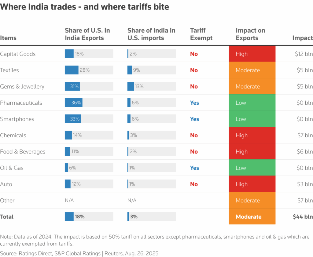 Bảng này cho thấy các lĩnh vực chủ yếu bị ảnh hưởng bởi thuế quan của Hoa Kỳ đối với Ấn Độ và tổng tác động tiềm ẩn đến số liệu thương mại.