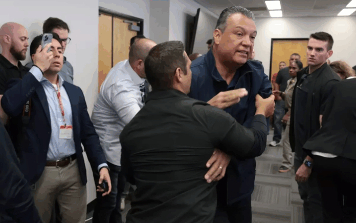 Cuộc họp báo bắt đầu với việc Padilla nhanh chóng ngắt lời Noem, và ngay lập tức bị những người có vẻ là nhân viên an ninh của bà Noem đối đầu.