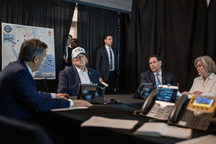 Sau đó, vượt qua những cánh cửa mạ vàng nặng nề và các lớp an ninh nghiêm ngặt tại cùng dinh thự này, ông đã theo dõi chiến dịch “Operation Epic Fury” diễn ra từ một không gian riêng biệt được chuyển đổi thành “phòng dã chiến”. Tại đây, Tổng thống cùng các trợ lý cấp cao và giới chức an ninh quốc gia đã quan sát các máy bay ném bom B-2 tấn công vào các mục tiêu quân sự của Iran, đồng thời lực lượng Israel nhắm vào giới lãnh đạo cấp cao của quốc gia này, cuối cùng tiêu diệt được Ayatollah Ali Khamenei. Tòa Bạch Ốc đã công bố những bức ảnh về không gian được che kín bởi các lớp rèm dày, trang bị đầy đủ các hàng điện thoại bảo mật và màn hình theo dõi.