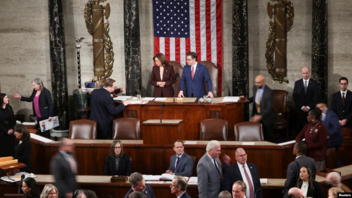 Bà Phó Tổng Thống Kamala Harris kiêm Chù tịch Thượng Viện chủ tọa phiên khoáng đại nầy cùng với Chủ tịch Hạ Viện Mike Johnson vừa được tái đắc cử chiều thứ Bảy 04-1-2025 cùng ngồi trên bàn chủ tọa.