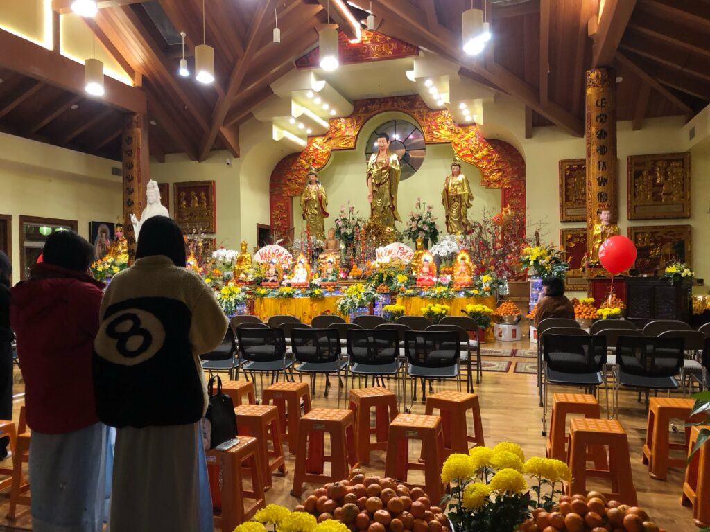 Về sinh hoạt tôn giáo, người Việt vẫn giữ nếp sống phong tục cũ. Dù mưa dầm rả rích, đường phố ướt át, lạnh lẽo; nhưng đồng bào Việt Nam vẫn giữ tập tục đi lễ chùa đêm giao thừa. Các ngôi chùa lớn, nhỏ trong vùng đều mở cửa đón khách du Xuân, lễ Phật và hái lộc. Ngay trung tâm thành phố, chùa Đức Viên 2420 McLaughlin Ave. rực rỡ đèn và hoa. Người đến xem và lễ bái thật đông; ngôi chùa Đại Nhật Như Lai, 1631 S. White Rd., San Jose cúng giao thừa lúc 10:30PM phật tử về lễ Phật, hái lộc, chúc Xuân. Chùa mở cửa đón đồng hương viếng chùa trong 3 ngày Tết từ 10:00AM . Và lễ Thượng Ngươn (Rằm tháng Giêng) vào ngày 1/3/2026 lễ Cầu Quốc Thái Dân An lúc 10:00AM