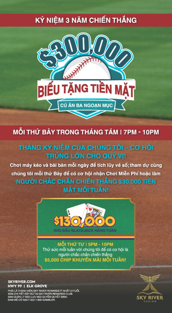Trong suốt tháng Tám, tháng kỷ niệm của Sky River Casino, khách hàng có cơ hội trúng thưởng lớn thông qua chương trình Biếu Tặng Cú Ăn Ba Ngoạn Mục $300,000. Khách chơi có thể tích lũy vé số mỗi ngày bằng cách chơi máy kéo và bài bàn, sau đó hòa mình vào không khí sôi động mỗi tối thứ Bảy để có cơ hội nhận Chơi Miễn Phí hoặc trở thành người chắc chắn chiến thắng giải tiền mặt $30,000. Chương trình diễn ra vào mỗi tối thứ Bảy trong tháng Tám, từ 7PM đến 10PM, với tổng giá trị giải thưởng lên tới $300,000 xuyên suốt tháng.
