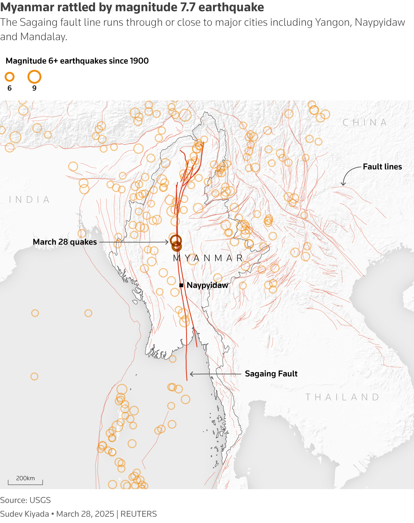 Vào thứ Sáu, trận động đất mạnh 7,7 độ richter – một trong những trận lớn nhất tại Myanmar trong thế kỷ qua – đã làm rung chuyển đất nước Đông Nam Á này, khiến khoảng 1.700 người thiệt mạng, 3.400 người bị thương và hơn 300 người mất tích tính đến Chủ nhật, theo chính quyền quân sự.