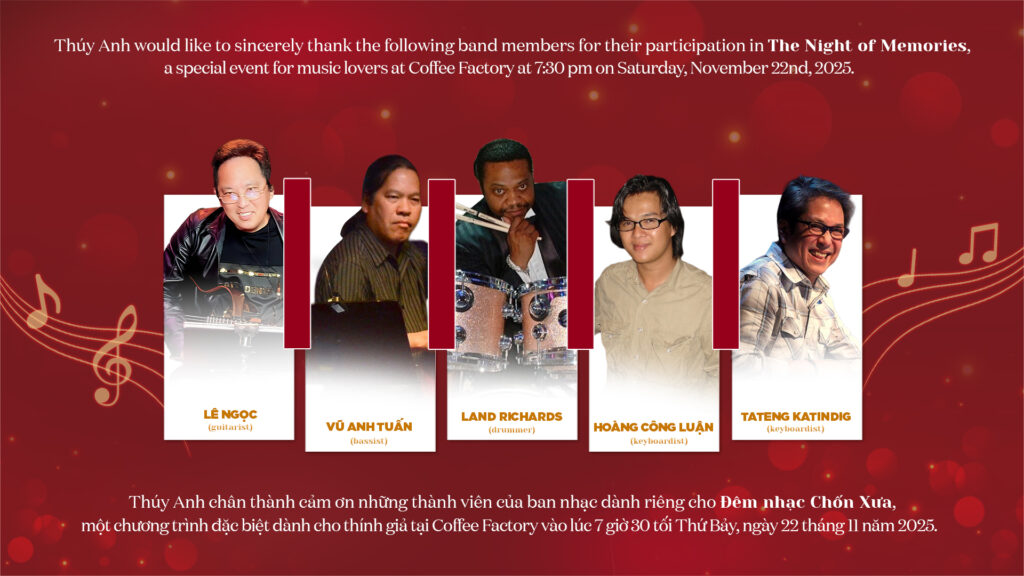 Vào tối Thứ Bảy, ngày 22 tháng 11 năm 2025, tại Điểm Hẹn Cà Phê Quận Cam, Coffee Factory (tọa lạc tại 15582 Brookhurst St, Westminster, CA 92683), ca sĩ Thúy Anh cùng hai tâm hồn văn nghệ tuổi đôi mươi, Ethan Trần và Henry Ngô, và những khách mời bất ngờ sẽ cống hiến cho quý thính giả một đêm nhạc được chuẩn bị kỹ luỡng từ âm thanh đến ban nhạc. Đêm nhạc Chốn Xưa do ca sĩ Thúy Anh tổ chức và biên tập với sự hỗ trợ của những bằng hữu đồng nghiệp. Ca sĩ Huy MC và Khôi Hồ phụ trách âm thanh. Ban nhạc bao gồm những thành viên giàu kinh nghiệm: Tateng Katindig (keyboardist), Lê Ngọc (guitarist), Vũ Anh Tuấn (bassist), Hoàng Công Luận (keyboardist), Land Richards (drummer). Quý khán thính giả muốn tham dự Đêm nhạc Chốn Xưa có thể nhắn tin 714.592.8941 để đặt vé: Vé đồng hạng $65 – Vé ưu đãi cho sinh viên $50 (Vé bảo trợ và VIP đã hết). Ban tổ chức có để vé tại Coffee Factory, 15582 Brookhurst St, Westminster, CA 92683.