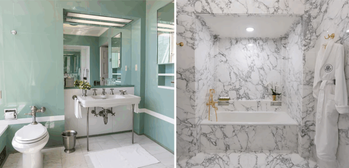Bản thiết kế của Truman năm 1945 mang tông màu xanh lam chủ đạo, thể hiện thị hiếu hiện đại của thời hậu chiến — nhưng giờ đây, dưới thời Trump, phòng tắm Lincoln đã được phủ lớp đá cẩm thạch sang trọng theo cách ông cho là “đúng tinh thần thời Lincoln.”