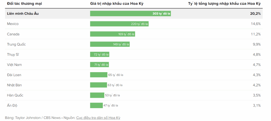 10 đối tác thương mại hàng đầu của Hoa Kỳ theo giá trị nhập khẩu