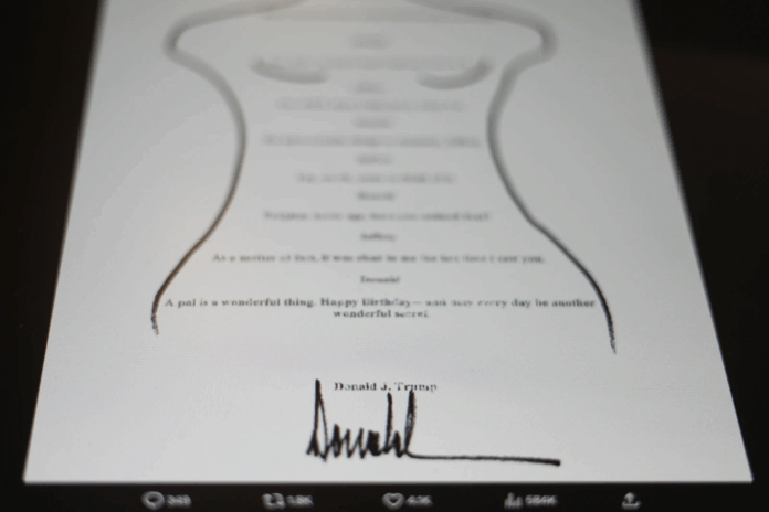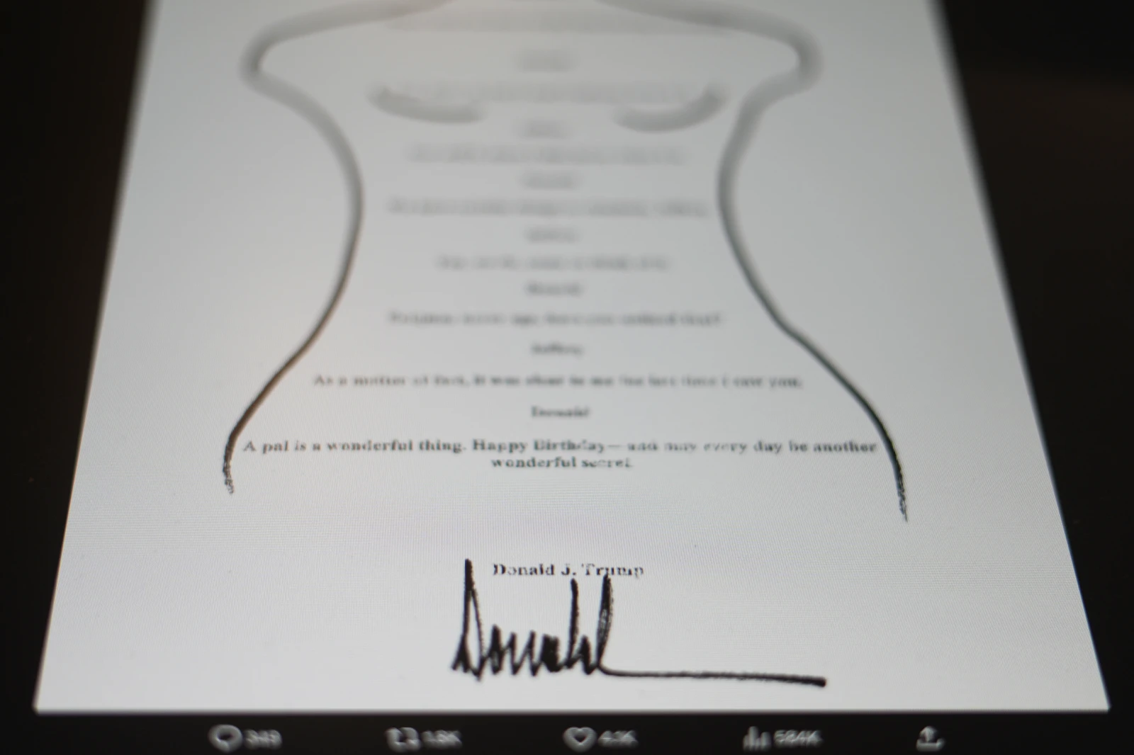 Trump khẳng định ông không viết bức thư này, cũng không vẽ hình người phụ nữ gợi cảm bao quanh lá thư. Ông đã kiện The Wall Street Journal đòi bồi thường 10 tỷ USD vì trước đó tờ báo này liên hệ ông với bức thư.