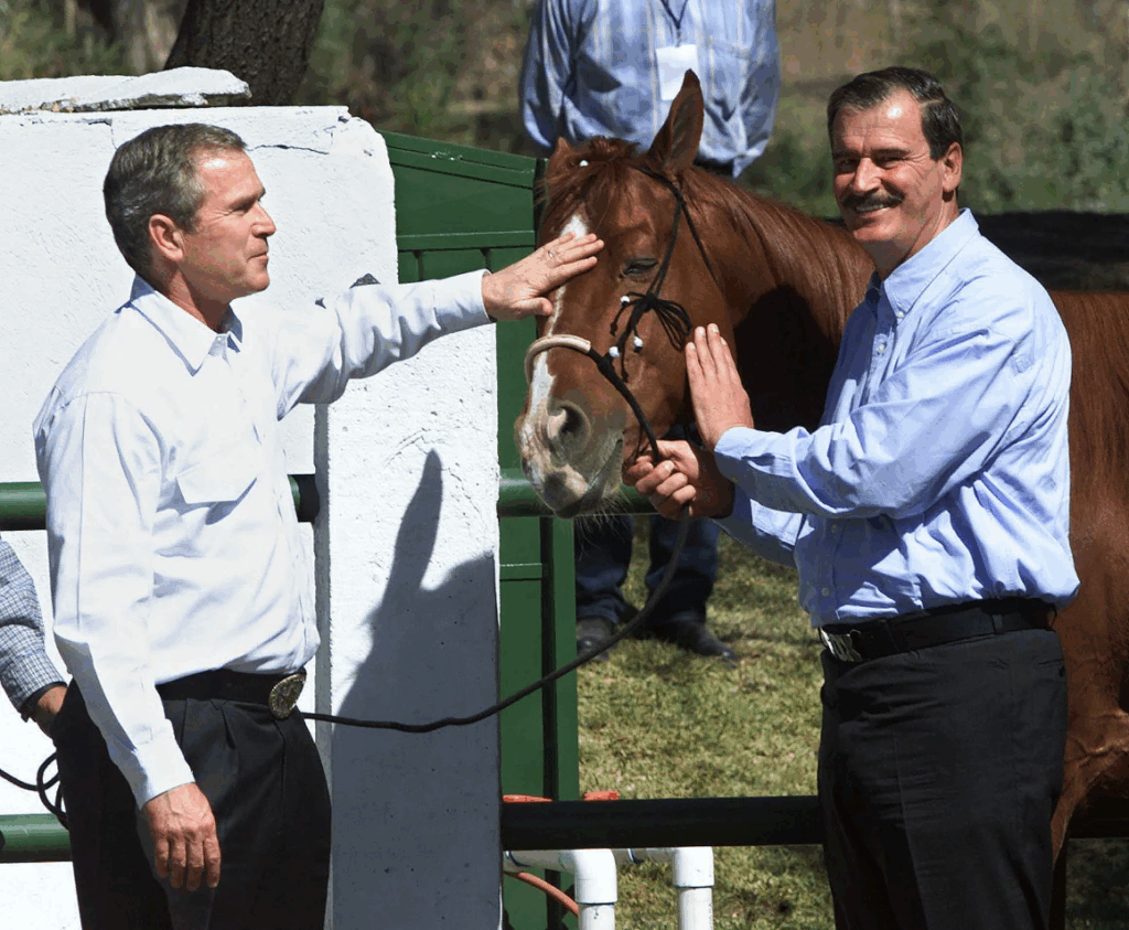 Tổng thống George W. Bush và Tổng thống Mexico Vicente Fox vuốt ve một trong những chú ngựa của Fox tại trang trại của gia đình Fox, Rancho San Cristobal ở Guanajuato, Mexico, vào tháng 2 năm 2001.