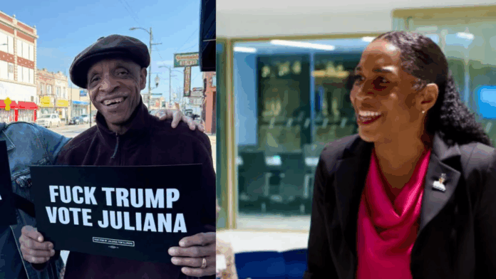 Sau một loạt thông điệp “F— Trump” khác, trong đó có lời của Duckworth, Thống đốc bang Illinois JB Pritzker (D) xuất hiện bên cạnh Stratton và nói: “Hãy bỏ phiếu cho Juliana.”
