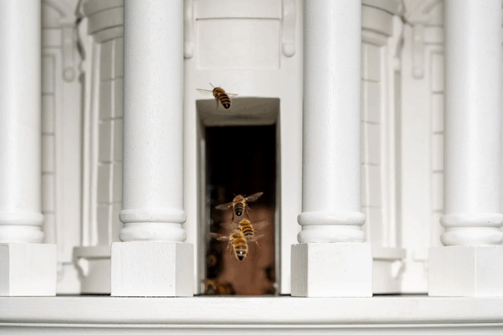 Những con ong bay xuyên qua cánh cửa của một tổ ong được chế tạo giống như Tòa Bạch Ốc, đặt trên bãi cỏ phía Nam của Nhà Trắng thật.Tín dụng…Alex Brandon/Associated Press