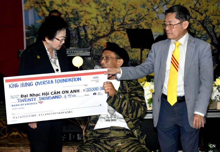 Trong phần phát biểu, anh kêu gọi mọi người đoàn kết, tiếp tục tranh đấu cho tự do và nhân quyền tại Việt Nam. Đồng thời, để thể hiện lòng tri ân đối với các thương phế binh VNCH, anh đã bất ngờ trao tận tay bà Thanh Thủy tấm chi phiếu trị giá 20.000 USD, giúp đỡ các anh em tại quê nhà trong tiếng vỗ tay vang dội của toàn hội trường.