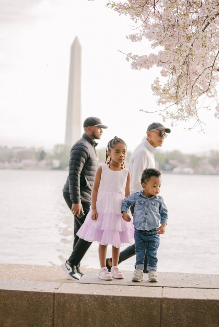 Trong ảnh, Obama đang thong thả dạo bước ở phía sau, trong khi hai đứa trẻ vui vẻ tạo dáng trước Hồ Tidal Basin và Đài tưởng niệm Washington.