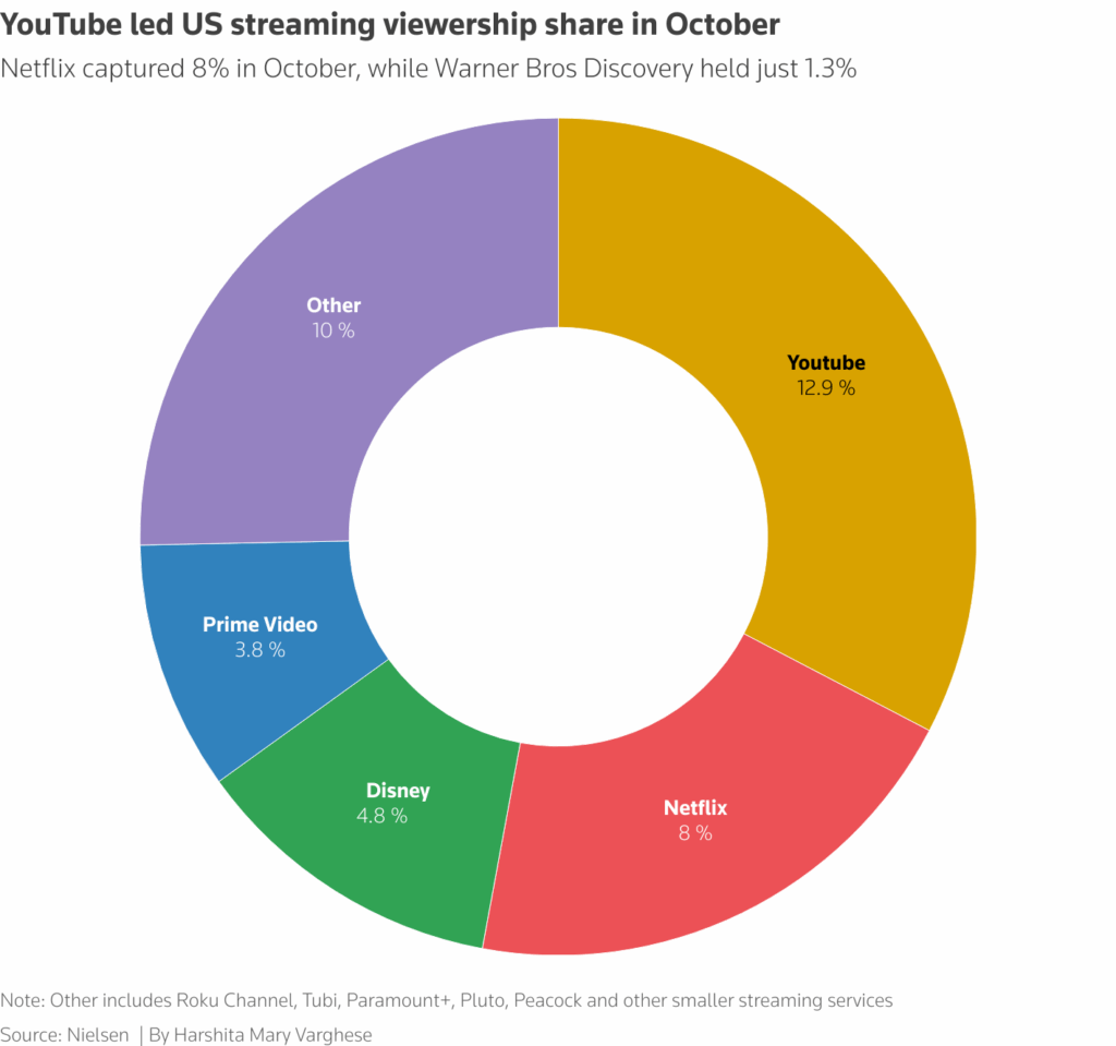 Tại Mỹ, YouTube dẫn đầu mảng phát trực tuyến trong tháng 10 với 12,9% thị phần xem, tiếp theo là Netflix với 8%, theo Nielsen. Warner Bros Discovery chỉ chiếm 1,3%.
