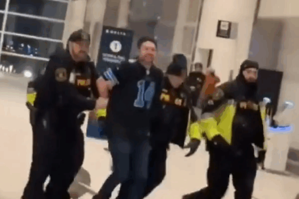 Người đàn ông chưa được xác định danh tính, mặc áo đấu của đội Detroit Lions, bị ghi lại cảnh la hét không rõ lời khi bị gần một chục nhân viên an ninh khống chế và dẫn đi, theo video lan truyền trên mạng xã hội.